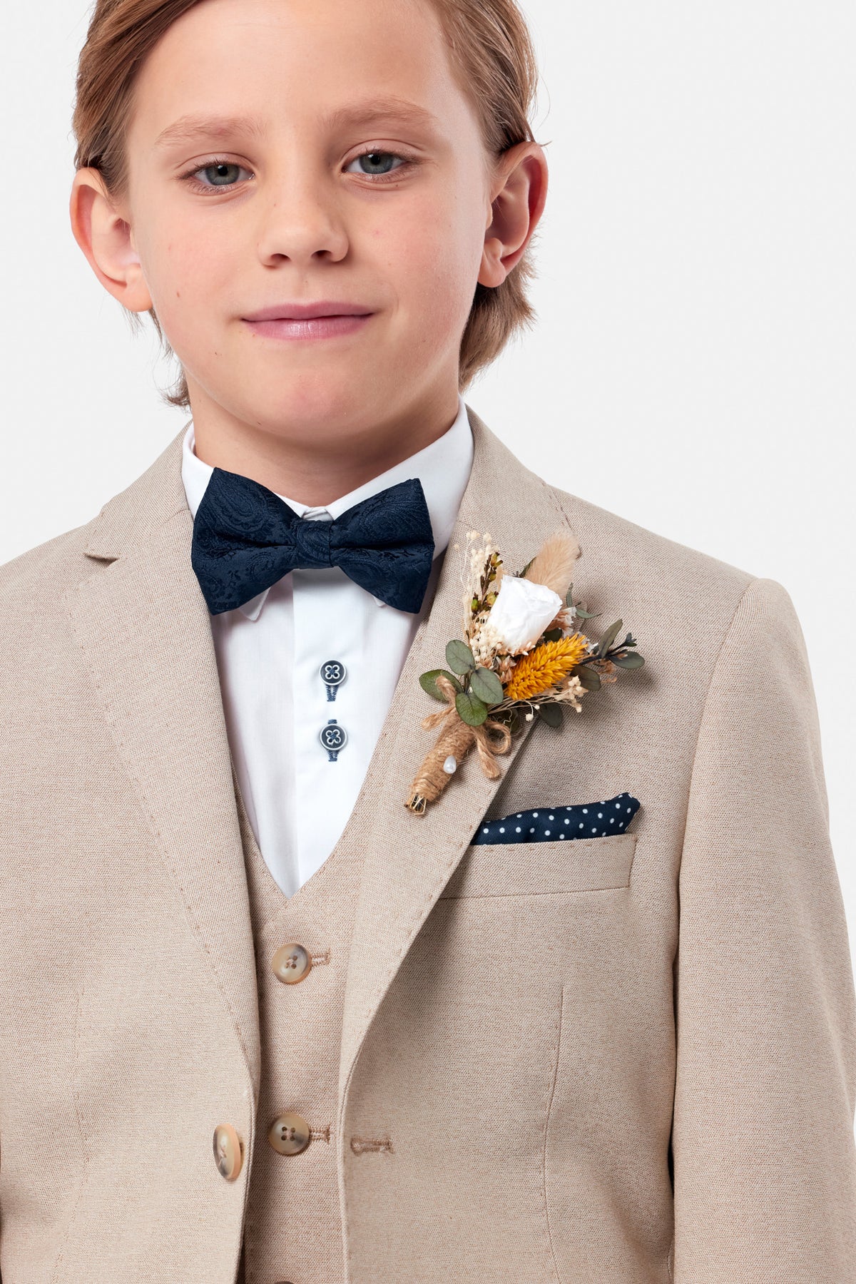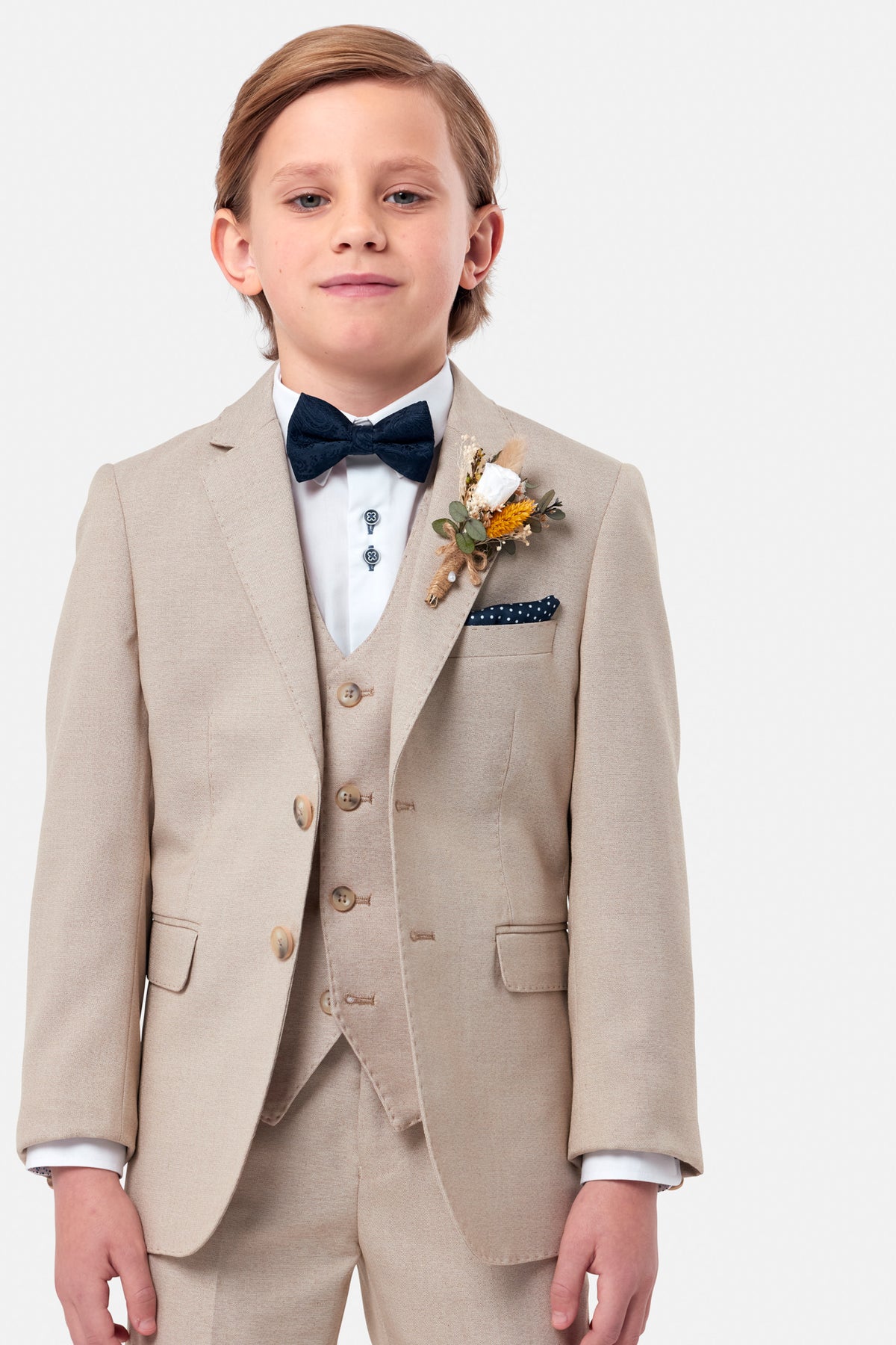 Elevate your son's formal wardrobe with this sophisticated Albert stone Waistcoat from Bennetti Boyswear. Crafted for the discerning parent, this classic piece brings timeless elegance to weddings, communions, and special occasions. The rich beige tone pairs effortlessly with dress shirts and trousers, creating a polished, put-together look that commands attention. Whether he's walking down the aisle or celebrating a milestone, this waistcoat ensures he looks absolutely dapper. A versatile investment that transitions beautifully from one formal event to the next.
