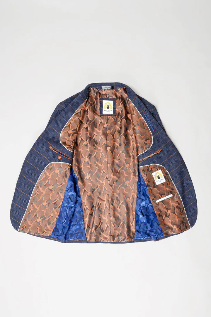 Jenson Marine Check characterful blazer is adorned in a Prince of Wales style check and will transform your work wear from dull to dapper. It is dual lined with a modern camouflage print and the rust orange hue in the check complements the blue marine shade superbly, allowing easy styling with tan accessories.