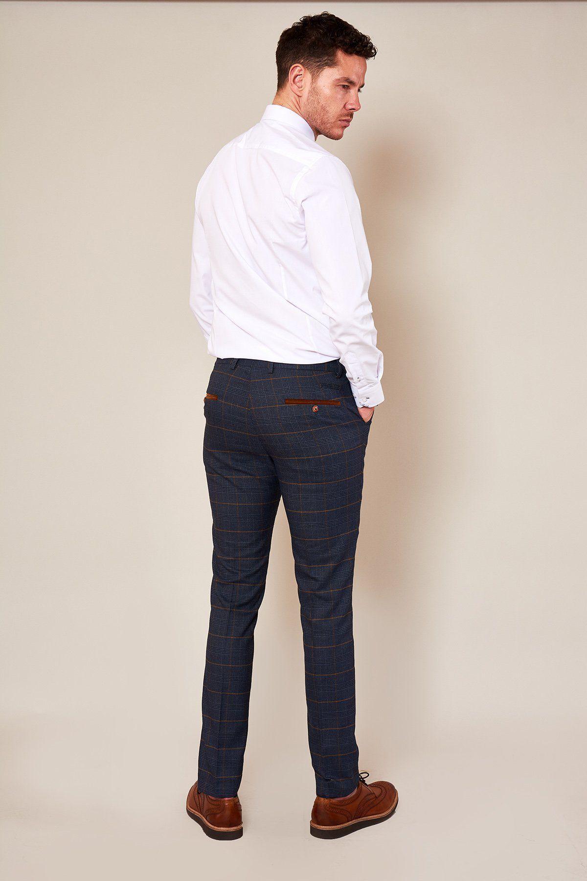 Jenson Marine skinny fit trousers. Cut to define and streamline the frame, these check trousers are a bold choice for those looking to step away from tradition. Style with a simple fine knit jumper and leather loafers for a relaxed vibe.