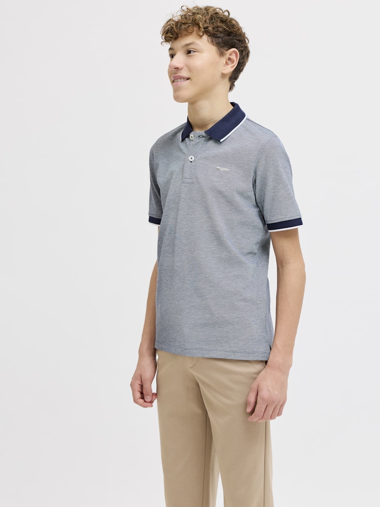 Young boy wearing a blue polo shirt with navy trim on a white background
