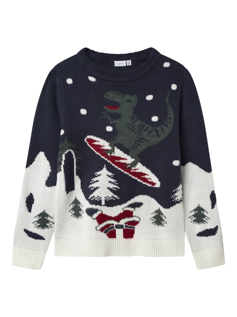Celebrate the festive season with the Rebo Long Sleeve Knit in Navy Blazer. This knitted pullover features a detailed jacquard pattern that adds texture and timeless style. Designed with a comfortable round neck, ribbed cuffs, and a regular fit, it keeps your child cozy while spreading holiday cheer wherever they go. Perfect for joyful moments and lasting memories.