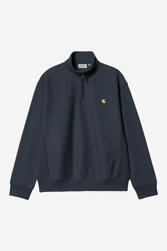 Elevate your everyday layering with this Half Zip American Script Sweatshirt, crafted from a substantial 12.3 oz cotton-polyester blend that delivers comfort without compromise. The brushed fabric creates a luxuriously soft feel while maintaining breathability, so you stay cosy without overheating. A structured highneck with functional zipper gives you versatile styling options, while the understated American embroidery adds authentic character. The relaxed, boxy silhouette flatters all builds and pairs effortlessly with your existing wardrobe. Perfect for casual days or layering under jackets, this sweatshirt combines quality construction with timeless appeal.