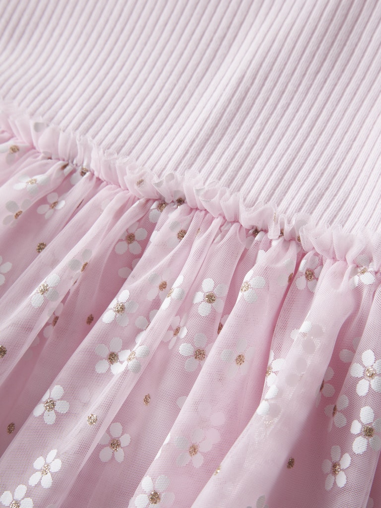 Refresh your child’s wardrobe with this charming Floral Dress designed for comfort and style. Crafted from rib knit fabric, it offers gentle stretch and a flattering fit for all-day wear. Featuring a round neck, short sleeves, and delicate tulle details, this dress adds a playful touch to any outfit. The glitter print adds sparkle, making it perfect for both casual days and special occasions. Practical yet eye-catching, this dress will quickly become a favorite in your little one’s collection.