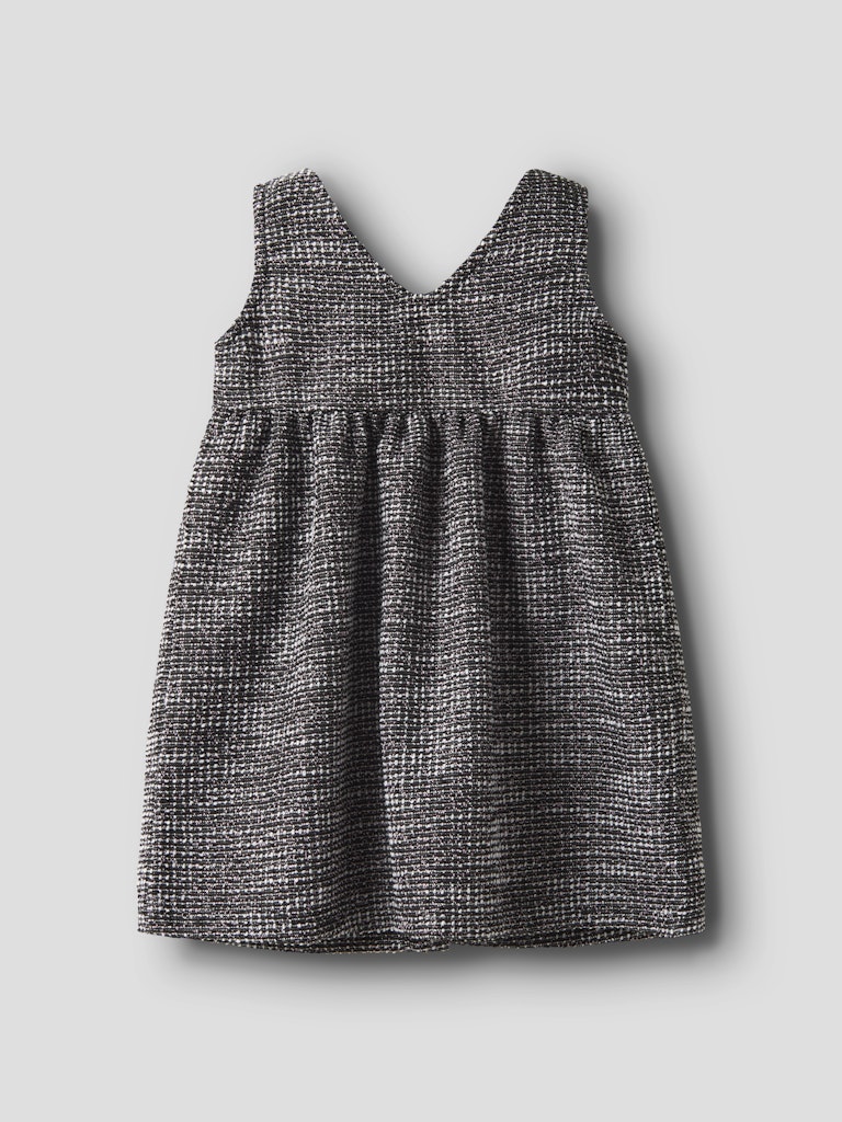 The Rikia Spencer Dress in black offers a comfortable, stylish fit with a soft jacquard pattern. Its sleeveless design, V-neck, and button fastening make it easy to wear for any occasion. A simple, elegant choice your child will love.