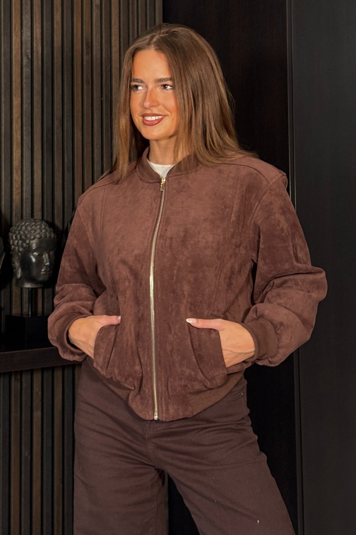 A versatile brown suedette bomber jacket that works with any outfit. The soft fabric feels luxurious while the structured cut flatters your figure. Layer it over casual wear for polish or dress it up for nights out. A timeless wardrobe staple that delivers effortless style.