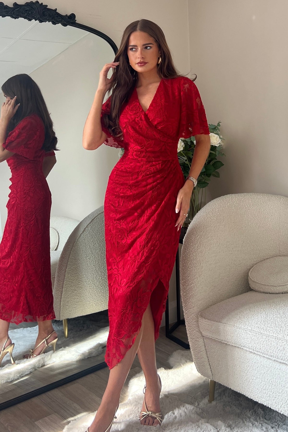 Natasha Angel Sleeve Wrap Midi Dress in Red Lace