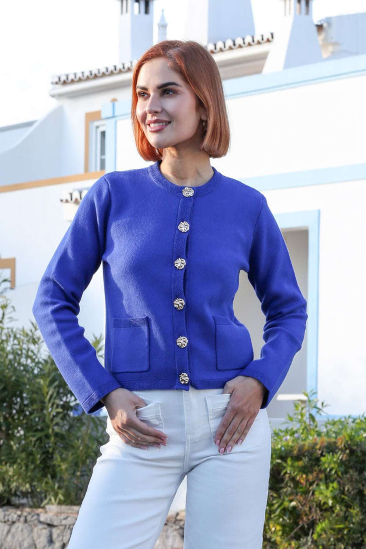 Woman wearing a blue cardigan with gold buttons in an outdoor setting