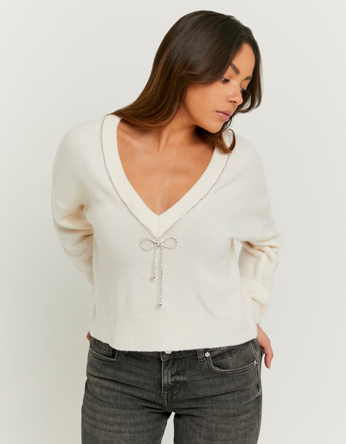 Soft, stylish, and effortlessly versatile—this white knitted jumper features a sparkling strass bow for that perfect blend of comfort and glamour. Pair it with jeans or faux leather for a look that works day or night.