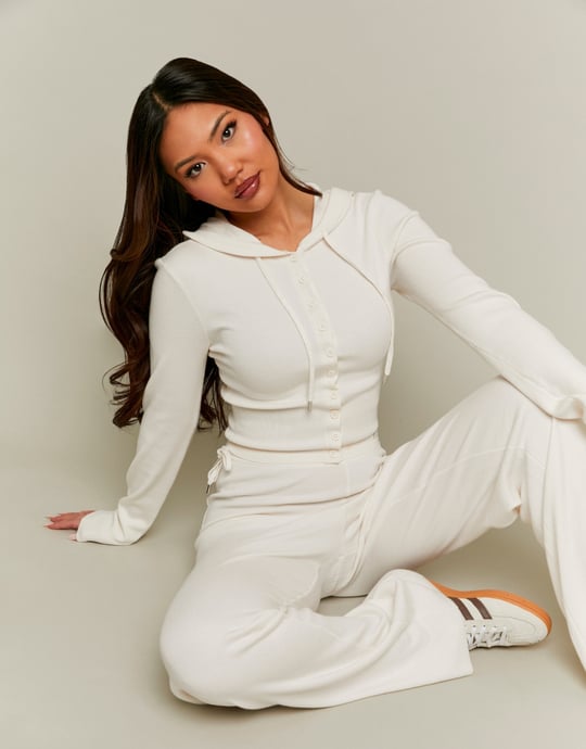 Soft white cardigan with button closure and cosy hood. The understated design works with everything—pair it with denim, trousers, or skirts for an easy, polished everyday look. Comfort meets versatility.