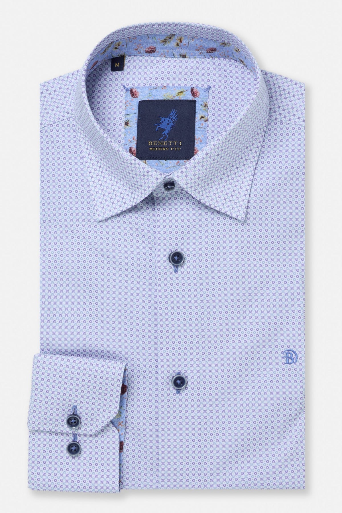 The Chris purple long sleeve shirt showcases a refined micro-geometric print woven throughout, adding subtle visual interest while maintaining timeless appeal. Tailored in Benetti's Modern Fit, this piece features a clean, contemporary silhouette that transitions effortlessly from casual to formal settings. Style it with tailored trousers for a polished everyday look, pair with chinos for relaxed sophistication, or layer beneath a blazer when you need to elevate your appearance. Versatile and refined, it's a wardrobe essential that works harder than it looks.