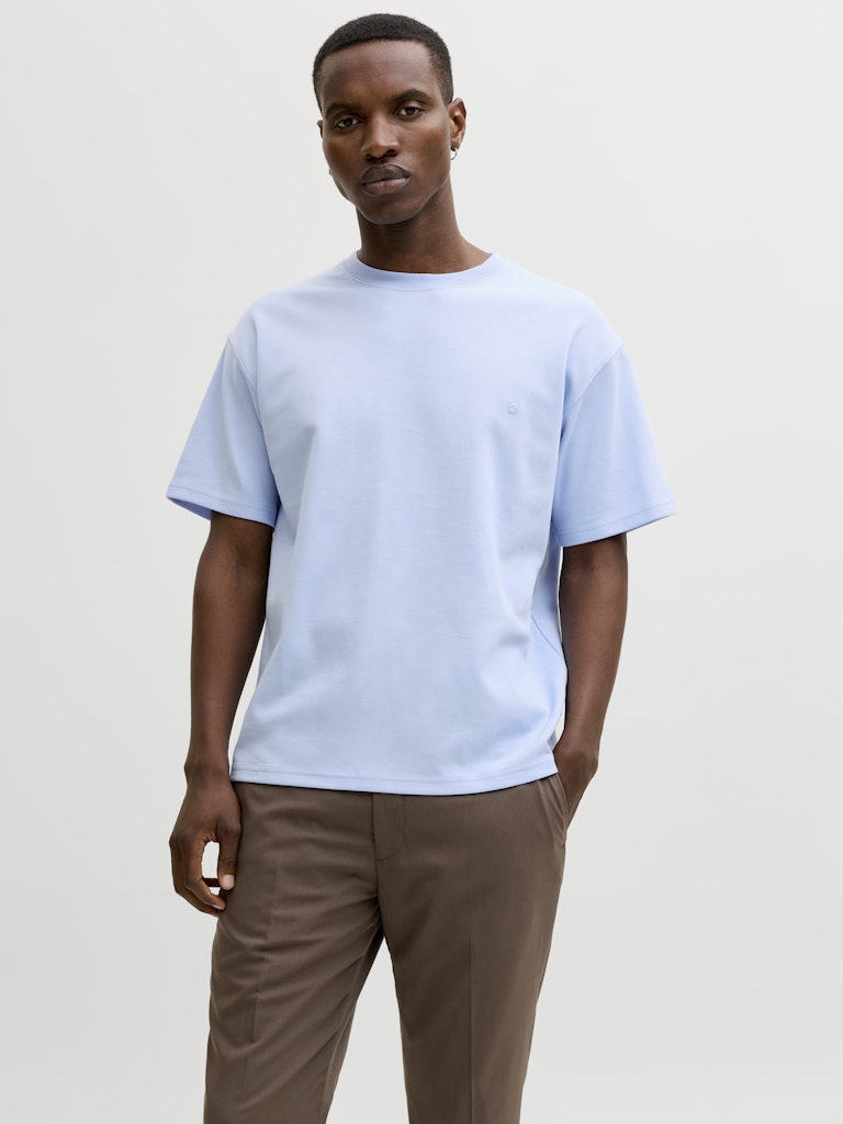 The Ethan Short Sleeve Logo Tee in Chambray Blue from Jack & Jones delivers effortless style and comfort for everyday wear.