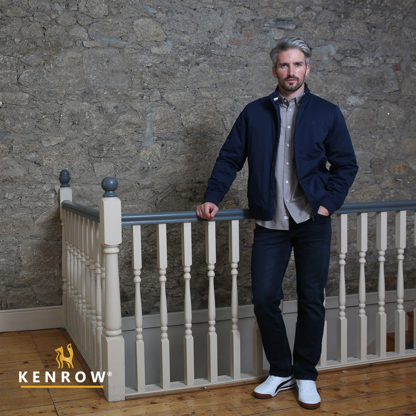 Man wearing a navy harrington/bomber style jacket and navy jeans