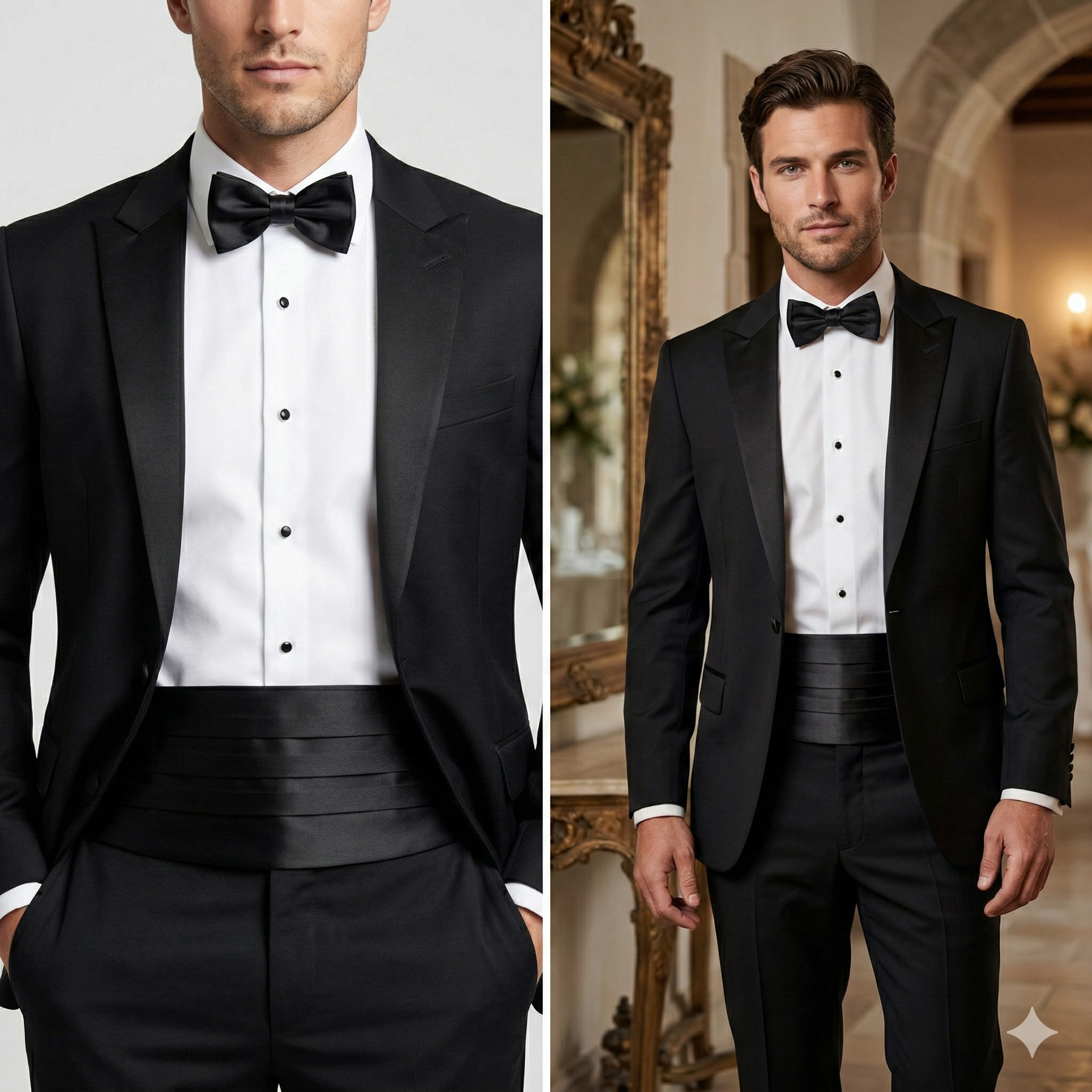 Elevate your formal evening wear with our Signature Black Pleated Satin Cummerbund. Meticulously crafted from premium, high-sheen satin, this essential accessory features four distinct, upward-facing horizontal pleats. Designed to create a seamless transition between your dress shirt and formal trousers, it delivers a refined, tailored silhouette. Perfect for galas, black-tie weddings, and any special occasion demanding classic sophistication. Discover the difference of refined detail.
