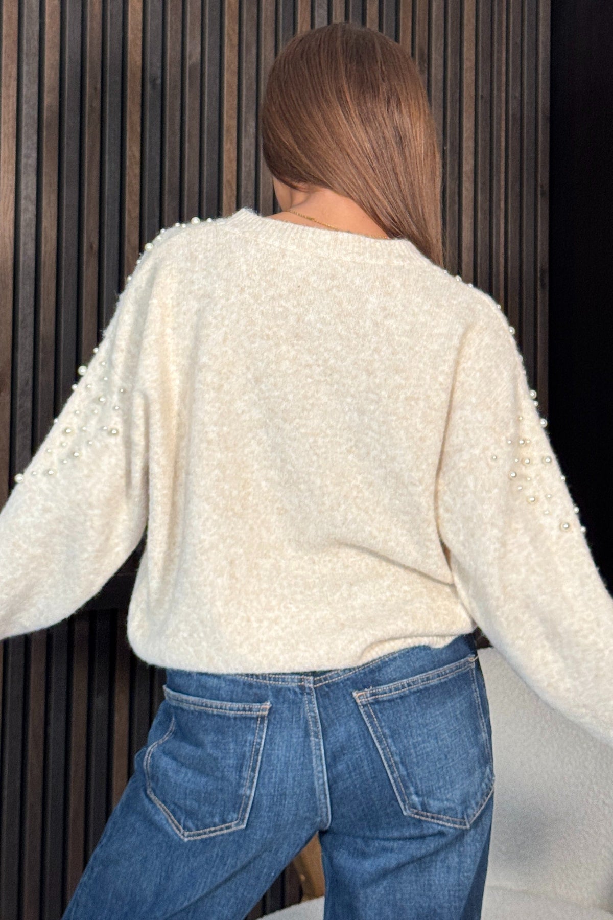 Rosaria Pearl Detail Round Neck Cream Jumper