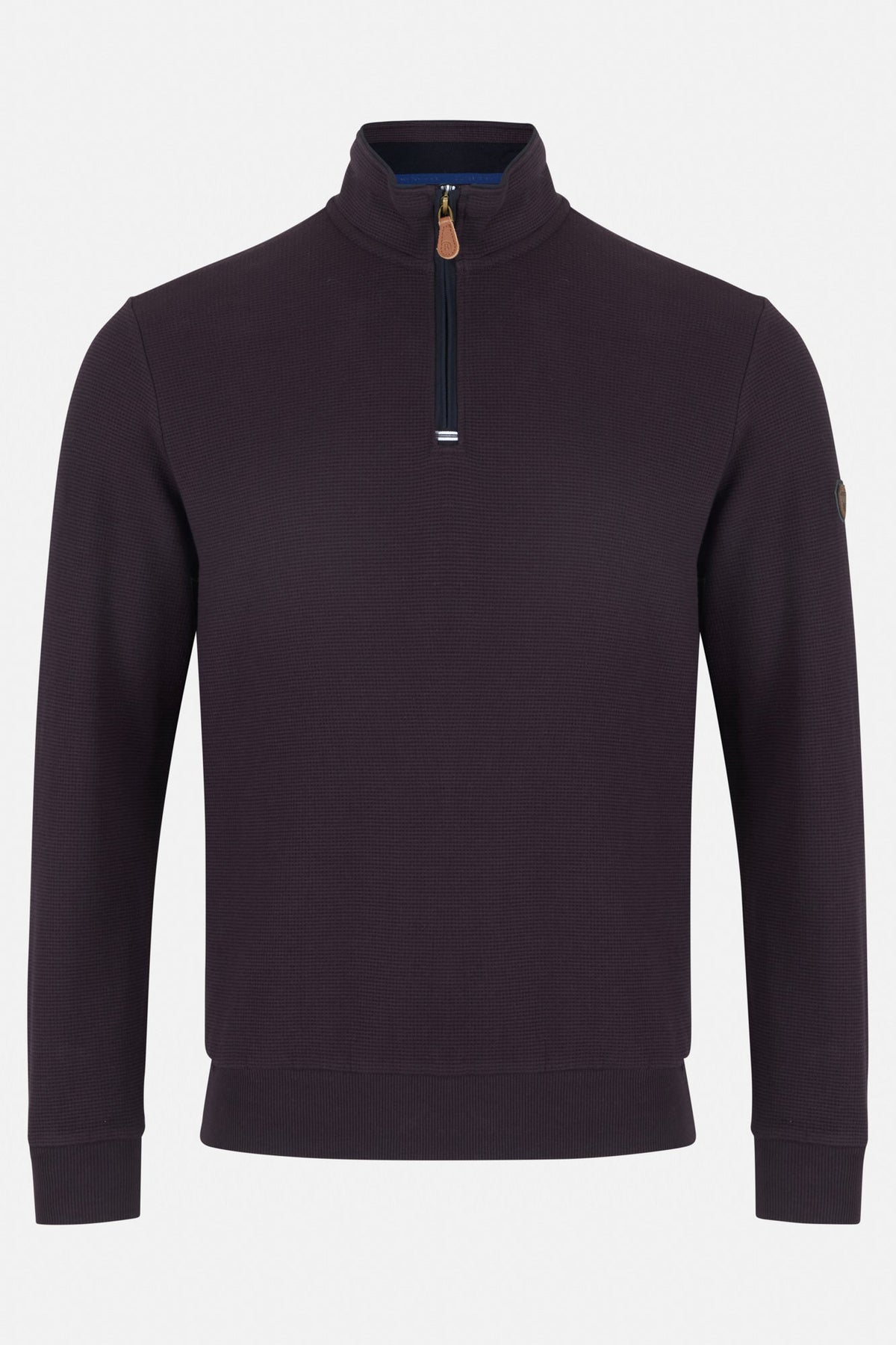 Grape colour sweatshirt with a quarter zip on a light gray background